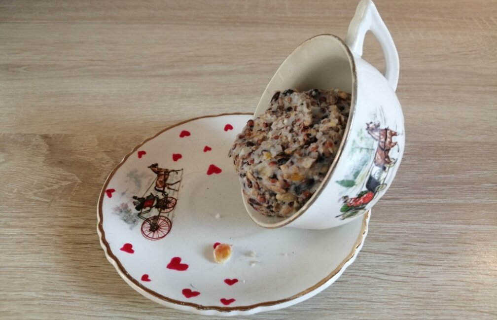- Dans un récipient propre, disposez une tasse de graines à oiseaux et une tasse de graisse végétale, mélangez à la main ou à la spatule.