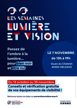 - Vendredi 7 novembre, à Orléans, de 15h à 19h : “Lumière & Vision” sur le quai du Châtelet à Orléans. Au programme : ateliers sur la thématique “Bien voir et être vu”, conseils et vérification gratuite des équipements de visibilités des utilisateurs de vélos, trottinettes et piétons.